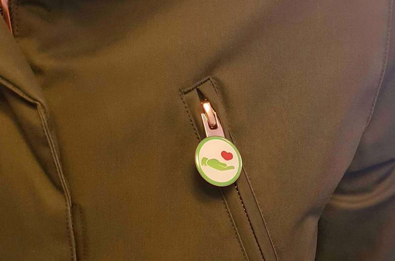 Rejser du med bus? I DemensHjørnet kan du få udleveret Bistå-nålen, som skal gøre det lettere for demensramte fortsat at bruge Midttrafiks busser.